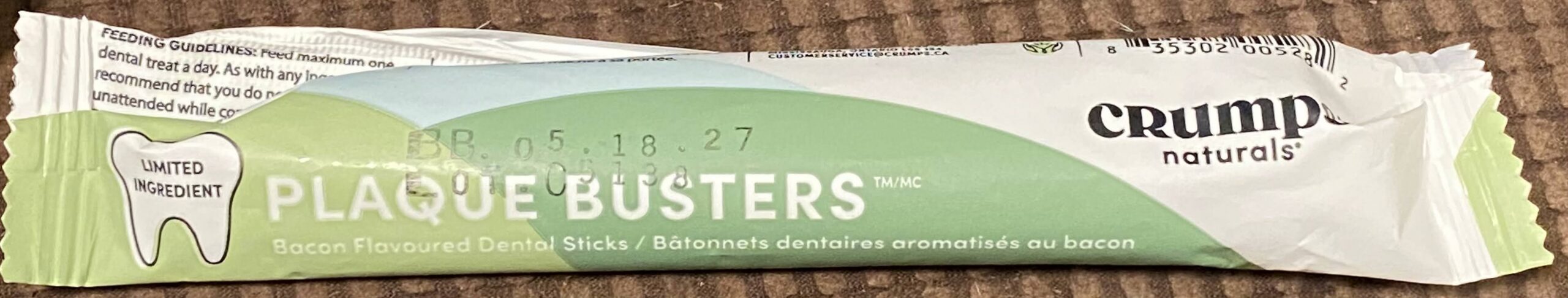 This one seems great as the #1 daily plaque fighter — 1 stick/day (size by weight: small <25lb=½, med 25-50lb=1, large >50lb=1-1½). It would replace brushing by about 80%. It’s for all ages/breeds, allergies, and overweight dogs. Limit how many they have, as it only contains <10% of your dog’s daily calories. You want to make sure to monitor their stools (fibre can firm) at least if they have a larger amount for the first time or two. As a tip, you could freeze them for a longer chew and or combine with jerky for balance.
