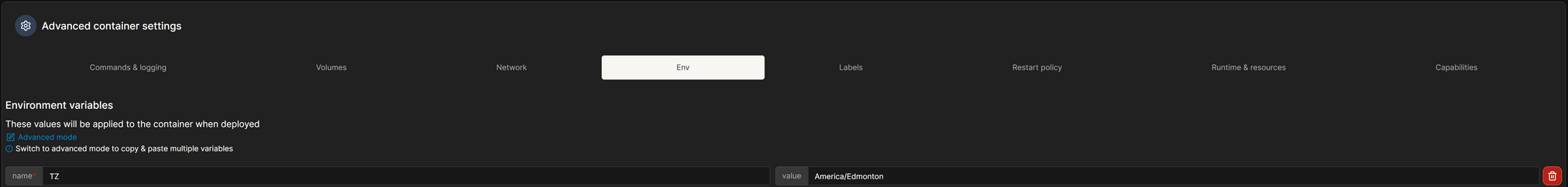 Copy/Paste the ‘TZ Identifier’ and add it to your Docker Compose file like so. If you don’t have the ‘environment’ section, you can copy and paste this.